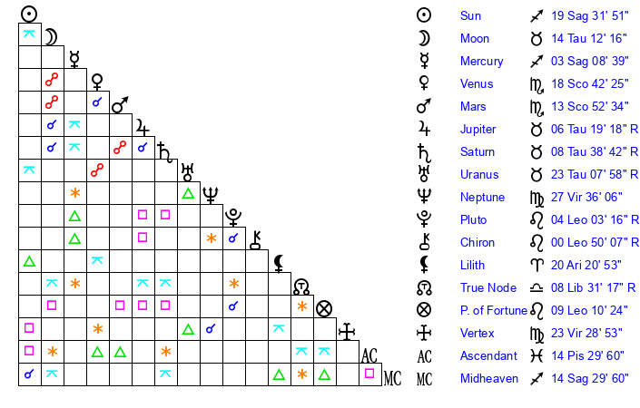| Moon | 14 Taurus 13 | 18 Virgo 1 | 19 Gemini 57 |