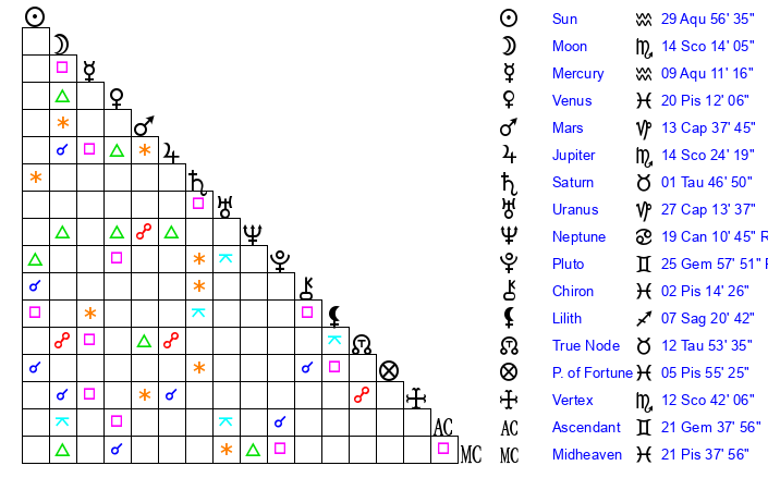 Sun | 29 Aquarius 57 | 1 Pisces 18 | 21 Gemini 33 |