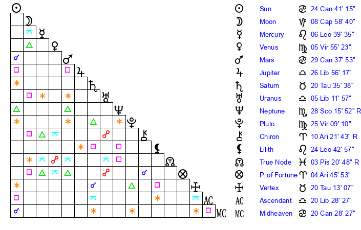 Mars | 29 Cancer 38 | 17 Virgo 37 | 4 Virgo 46 |