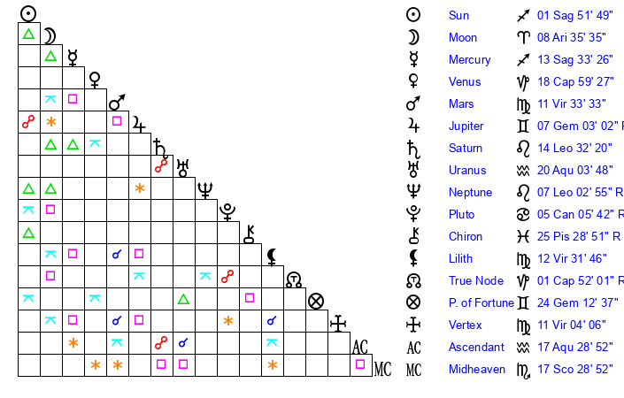 | Sun | 1 Sagittarius 51 | 2 Sagittarius 55 | 20 Pisces 19 |