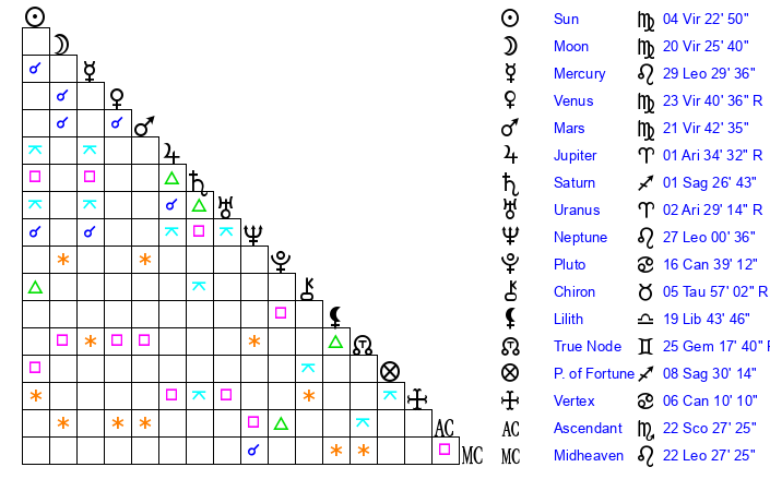 | Moon | 20 Virgo 25 | 7 Scorpio 46 | 16 Aries 11 |