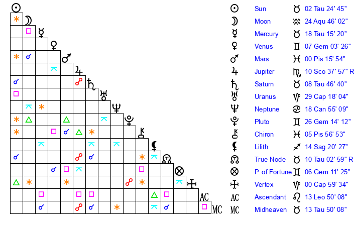 Sun | 2 Taurus 25 | 3 Taurus 47 | 21 Leo 44 |