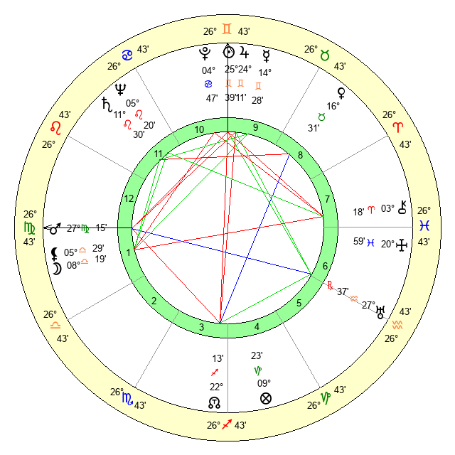 | Sun | 25 Gemini 39 | 26 Gemini 45 | 8 Libra 40 |