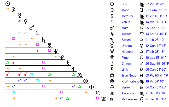 | Venus | 14 Virgo 51 | 1 Leo 13 | 28 Virgo 57 |
