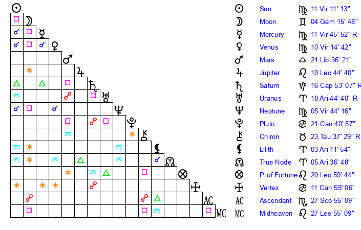 | Venus | 10 Virgo 15 | 12 Leo 1 | 7 Capricorn 28 |