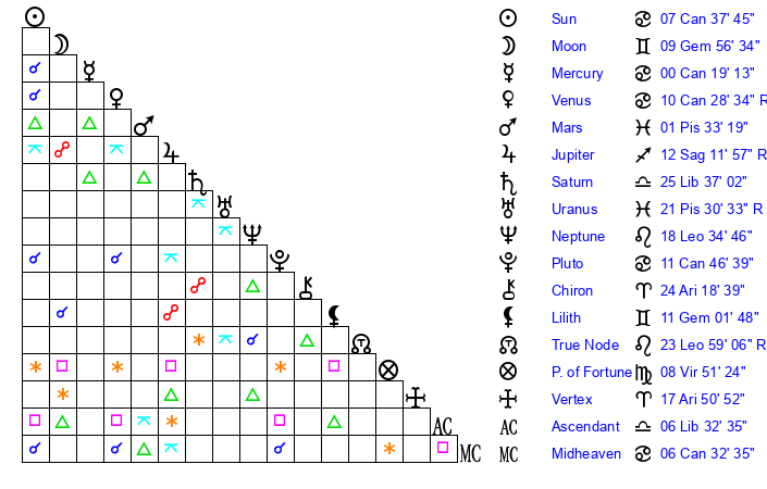 | Pluto | 11 Cancer 47 | 3 Aquarius 9 | 13 Cancer 33 |