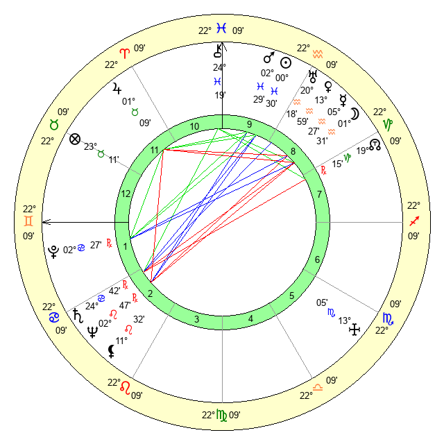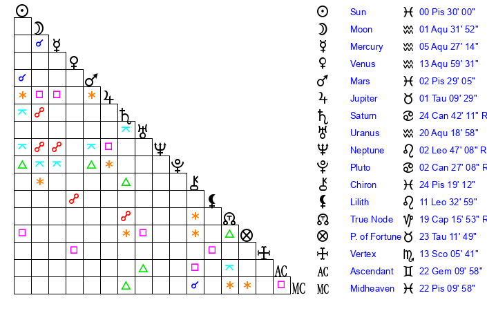 | Sun | 0 Pisces 30 | 1 Pisces 18 | 16 Gemini 20 |