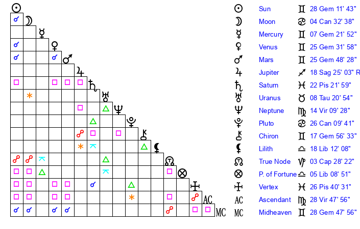 | Sun | 28 Gemini 11 | 28 Gemini 40 | 23 Virgo 37 |