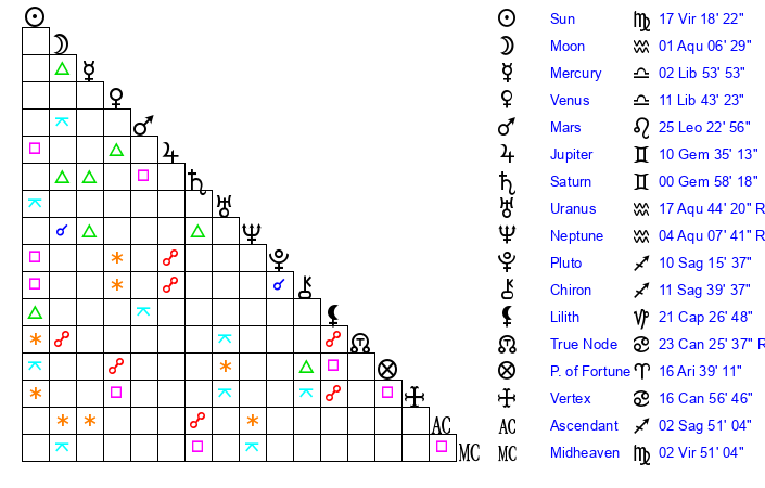 Pluto | 10 Sagittarius 15 | 1 Aquarius 37 | 10 Sagittarius 42 |