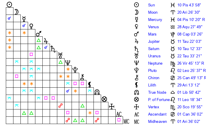 | Sun | 10 Pisces 44 | 11 Pisces 22 | 3 Gemini 7 |