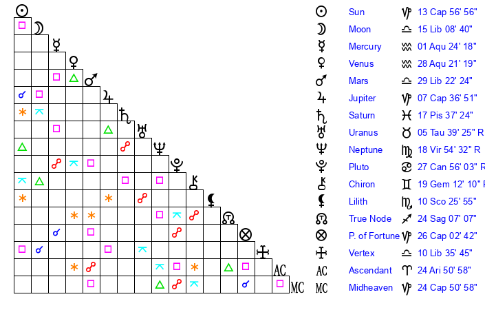 | Moon | 15 Libra 10 | 1 Leo 55 | 8 Capricorn 12 |