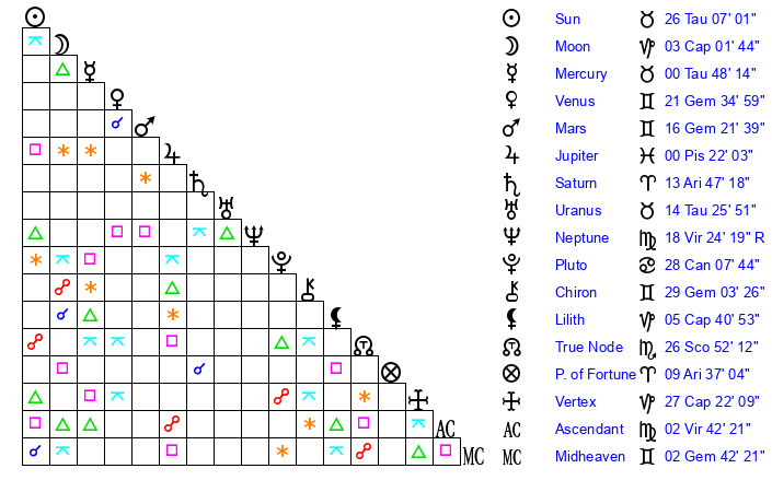 | Sun | 26 Taurus 7 | 27 Taurus 2 | 19 Leo 18 |