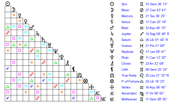 | Sun | 15 Gemini 26 | 16 Gemini 0 | 22 Virgo 19 |