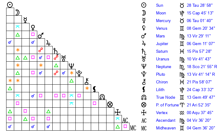 Uranus | 10 Virgo 46 | 27 Taurus 25 | 12 Virgo 20 |