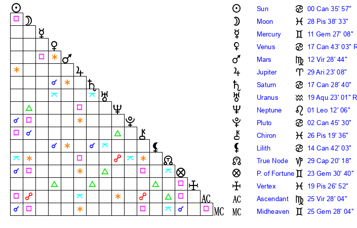 | Pluto | 2 Cancer 45 | 3 Aquarius 18 | 4 Cancer 24 |
