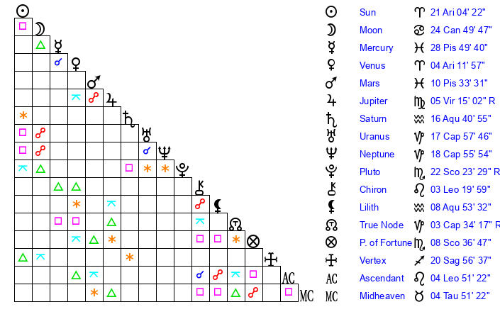 | Venus | 4 Aries 12 | 24 Pisces 45 | 14 Taurus 49 |