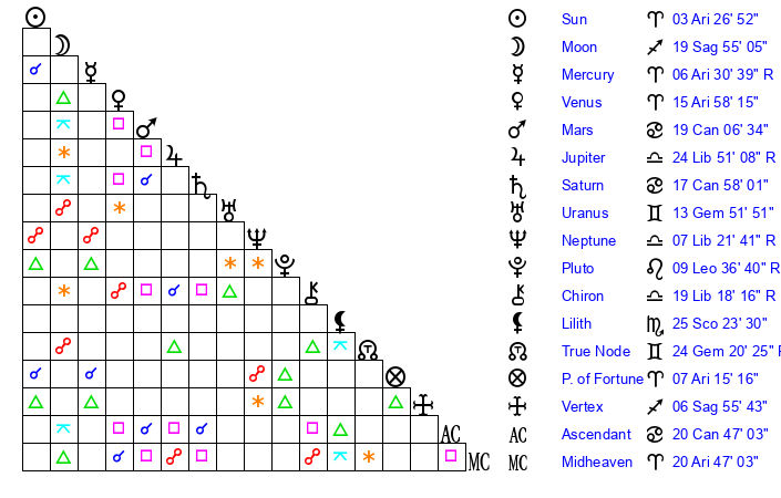 | Venus | 15 Aries 59 | 1 Aries 38 | 22 Cancer 16 |