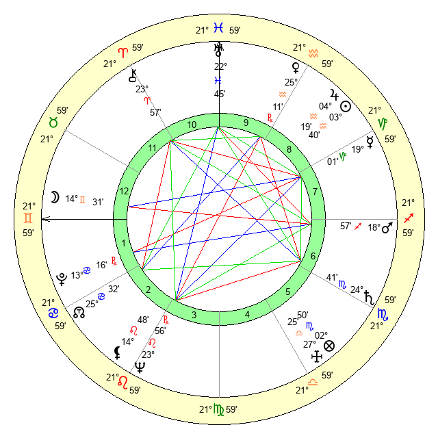 | Moon | 14 Gemini 31 | 2 Sagittarius 40 | 19 Capricorn 50 |