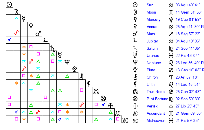 | Moon | 14 Gemini 31 | 2 Sagittarius 40 | 19 Capricorn 50 |