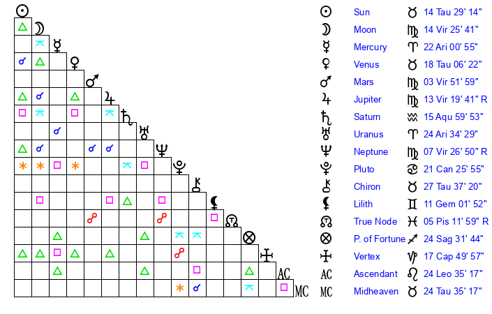 | Sun | 14 Taurus 29 | 15 Taurus 12 | 12 Leo 33 |