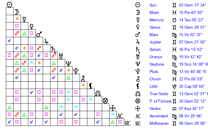 Sun | 3 Gemini 18 | 3 Gemini 46 | 0 Leo 37 |