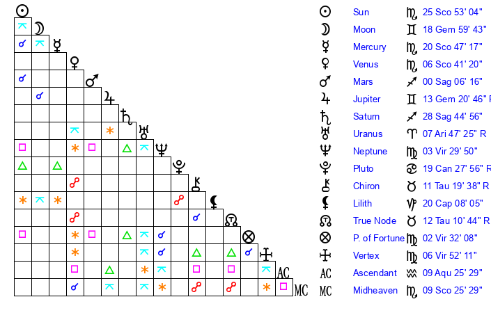 | Sun | 25 Scorpio 53 | 26 Scorpio 51 | 2 Pisces 21 |