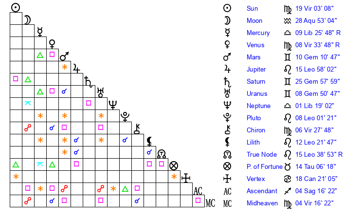 | Sun | 19 Virgo 3 | 20 Virgo 11 | 10 Sagittarius 40 |