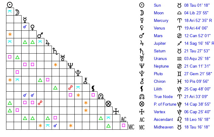 Sun | 8 Taurus 1 | 8 Taurus 39 | 26 Leo 18 |