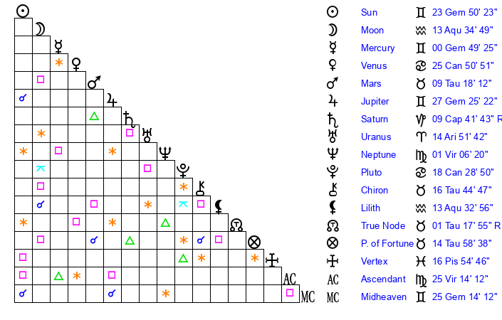 | Sun | 23 Gemini 51 | 24 Gemini 50 | 25 Virgo 2 |