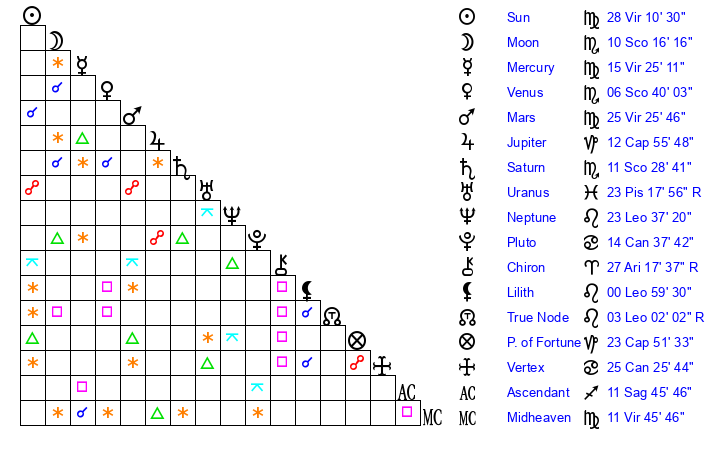 | Saturn | 11 Scorpio 59 | 28 Pisces 21 | 23 Scorpio 9 |