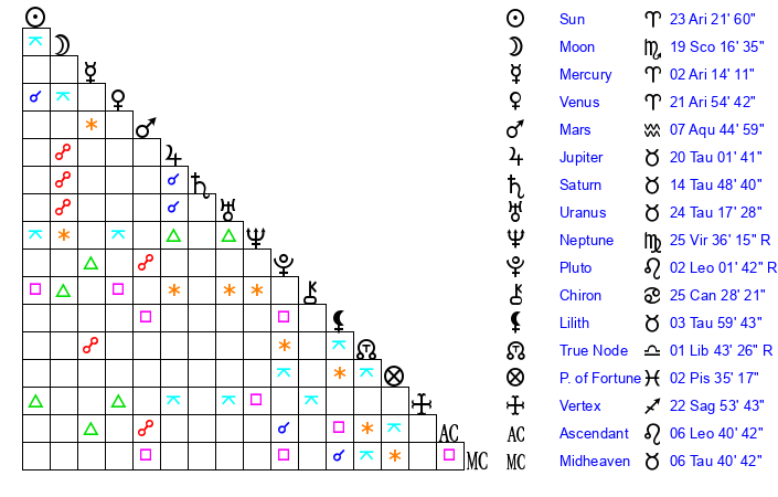 | Venus | 21 Aries 55 | 24 Pisces 39 | 5 Leo 7 |