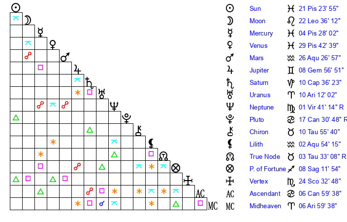 | Neptune | 1 Virgo 41 | 29 Pisces 19 | 1 Virgo 7 |
