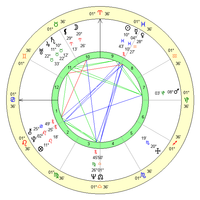 | Sun | 10 Pisces 44 | 11 Pisces 22 | 3 Gemini 7 |