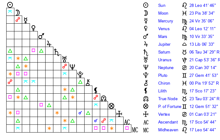| Moon | 23 Pisces 34 | 23 Leo 4 | 12 Gemini 19 |