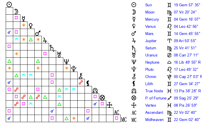 | Moon | 7 Virgo 15 | 25 Sagittarius 28 | 3 Gemini 54 |