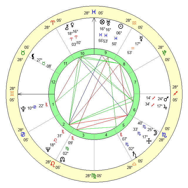 | Sun | 6 Pisces 50 | 8 Pisces 21 | 15 Gemini 40 |
