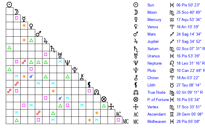 | Sun | 6 Pisces 50 | 8 Pisces 21 | 15 Gemini 40 |
