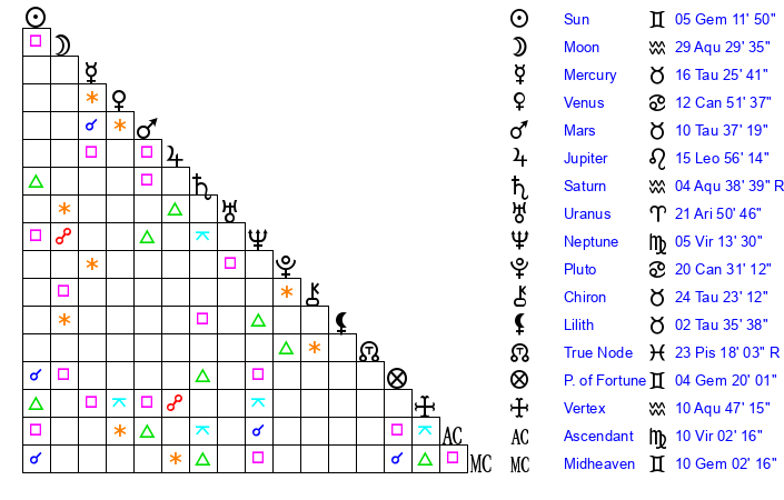 | Moon | 29 Aquarius 34 | 29 Taurus 50 | 12 Cancer 35 |