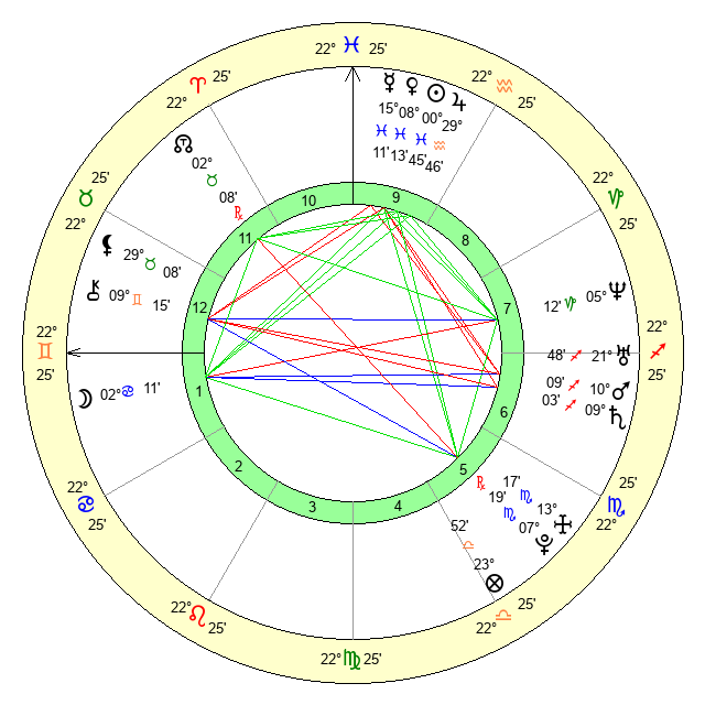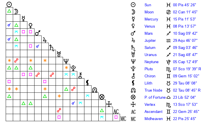| Sun | 0 Pisces 45 | 1 Pisces 18 | 9 Aries 42 |