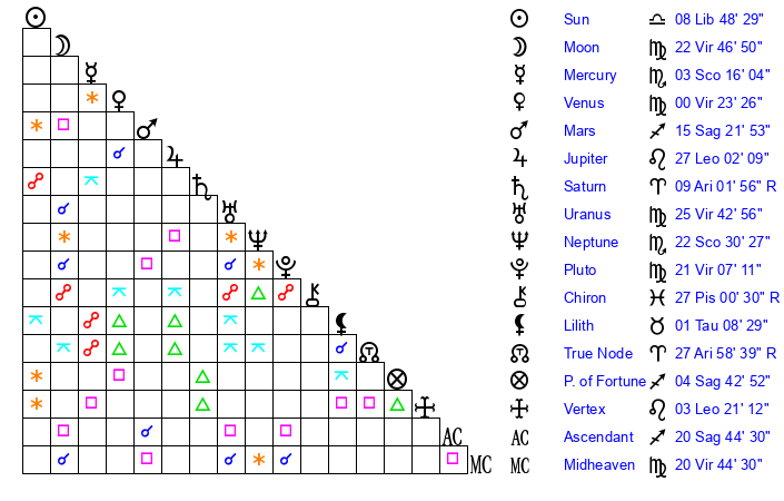 Moon | 22 Virgo 42 | 11 Aquarius 25 | 9 Scorpio 19 |