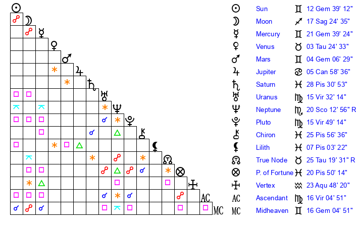 Sun | 12 Gemini 39 | 13 Gemini 22 | 8 Leo 59 |