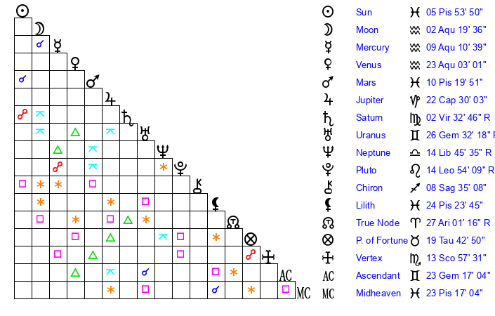 | Sun | 5 Pisces 54 | 6 Pisces 28 | 20 Taurus 46 |