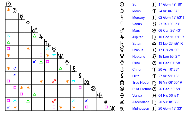 | Sun | 17 Gemini 49 | 19 Gemini 6 | 25 Virgo 43 |