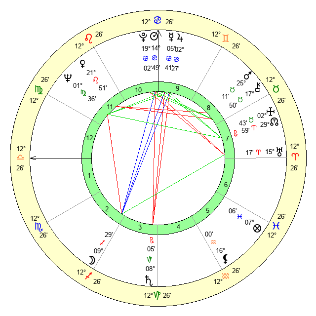 | Mercury | 5 Cancer 42 | 11 Leo 25 | 29 Virgo 21 |