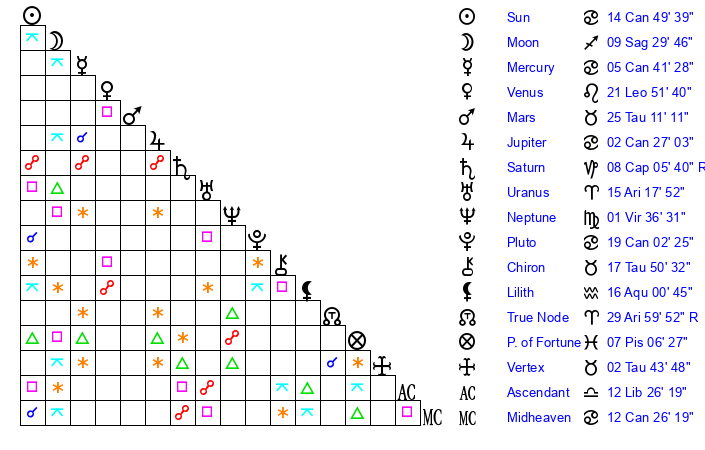 | Pluto | 19 Cancer 3 | 2 Aquarius 59 | 20 Cancer 52 |