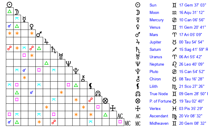 | Sun | 17 Gemini 37 | 18 Gemini 9 | 20 Virgo 38 |