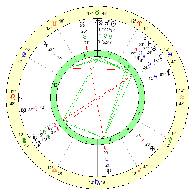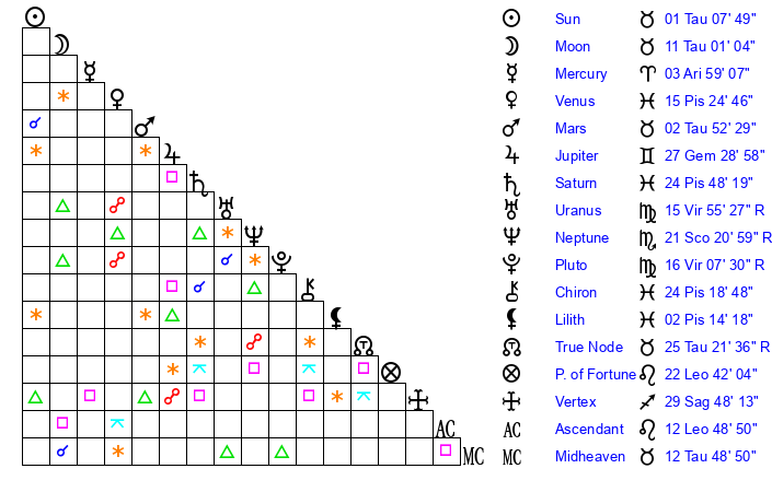 Sun | 1 Taurus 8 | 1 Taurus 50 | 27 Gemini 57 |
