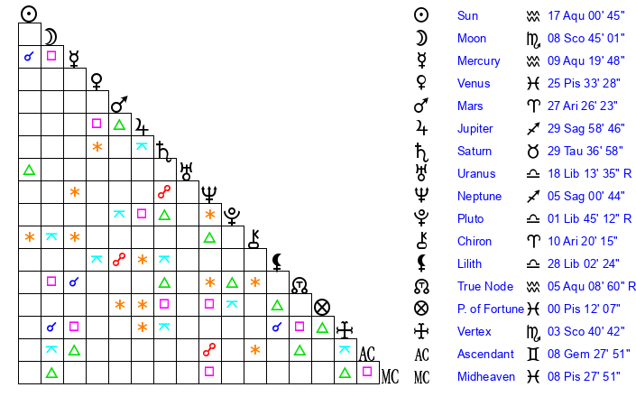 Sun | 17 Aquarius 0 | 18 Aquarius 9 | 10 Aries 5 |