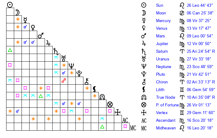 Mercury | 8 Virgo 38 | 8 Leo 24 | 22 Libra 16 |
