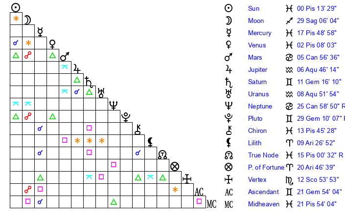 | Sun | 0 Pisces 13 | 1 Pisces 18 | 18 Gemini 56 |